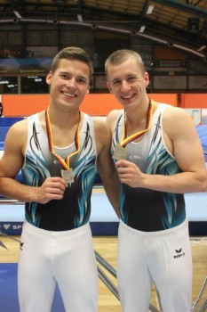 Gleich einen Tag nach den Einzelwettkämpfen ging es für alle Altersklassen mit den Synchronwettkämpfen weiter. Aus Hamburg ging auch wieder Daniel Schmidt mit seinem Partner Immanuel Kober aus Stuttgart an den Start. Sie turnen nicht zum ersten Mal zusammen, aber ein regelmäßiges Training aufgrund der unterschiedlichen Wohnorten ist schon schwierig. Somit musste das Einturntraining bei den Deutschen Meisterschaften ausreichend sein. Im Wettkampf musste Daniel mit Immanuel (Manu) gleich als erstes Paar auf das Gerät. Können die Beiden gleich schon eine gute Vorgabe machen ? Bis zum 9. Sprung sah die Übung schon nahezu perfekt aus. Gute Haltung und die Synchronität war sehr gut. Dann der letzte Sprung..... Daniel verzieht den letzten Sprung etwas nach hinten und berührt ganz knapp die Abdeckung. Wertung ab 9 und ein guter Wert mit möglichen 39 Punkten ist dahin. Die anderen Synchronpaare turnten nahezu alle gute Übungen und so lagen Manu und Daniel nach der Pflicht auf dem 10. Platz. Für das Finale musste nun eine punktreiche Kürübung gezeigt werden. Dies gelang den beiden auch und mit 46,600 Punkten konnten sie sich sogar bis auf den 2. Platz vorschieben. Andere Favoriten hatten etwas Pech und patzten in der Kür und erreichten das Finale dann nicht mehr. Im Finale ab Null blieben Daniel und Manu bei der etwas leichteren Übung von 10,6. Die Übung lief wieder ganz gut und ein Wert von 46,300 wurde angezeigt. Ein Synchronpaar aus München (Rick & Matthias) hatten kurz vorher auf volle Schwierigkeit gesetzt und wurden mit 46,500 belohnt, dies war der Deutsche Meistertietel für München. Für das Hamburg/Stuttgart-Paar blieb es beim Deutschen Vizemeister. Allen Athleten herzlichen Glückwunsch. Manu und Daniel werden auch bei der Weltmeisterschaft turnen und dort soll dann auch "volles Programm" mit 15,6 SW geturnt werden. Vorher haben die beiden dann aber auch noch im WM-Vorbereitungslehrgang einige Einheiten und können ihre Übungen noch besser abstimmen.